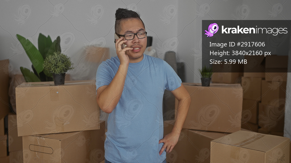 Man holding smartphone to ear with hand on hip amid stacked moving boxes in building; moving day frustration.