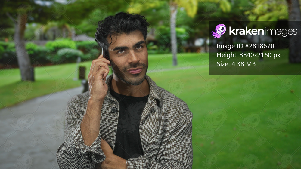 Man holding smartphone to ear in green forest on winding pathway under tall leafy trees with relaxed posture; serenity.