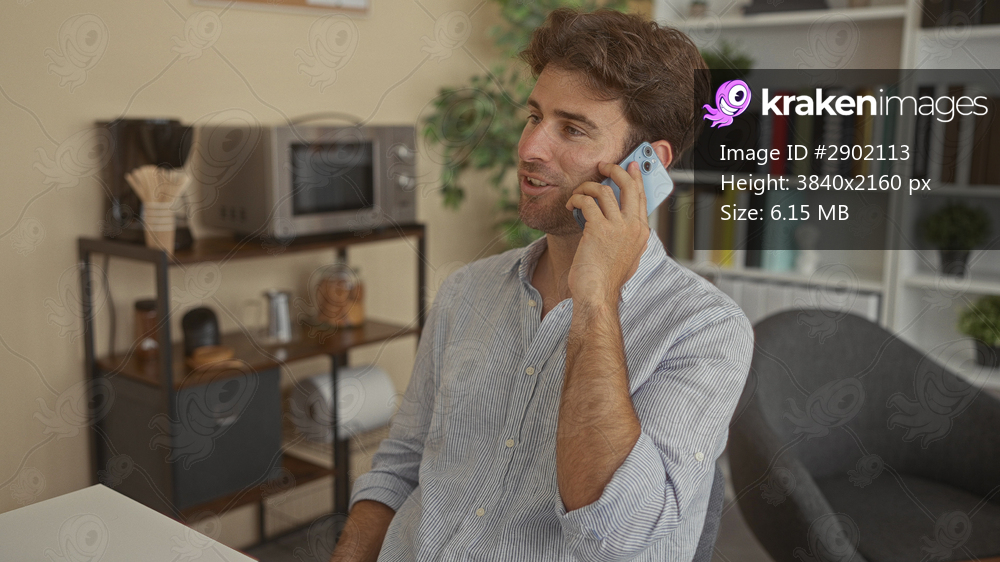 Man holding smartphone to ear in office, seated at desk with shelving and microwave visible; work focus.