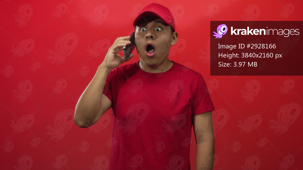 Man holding smartphone to ear with mouth open and hand raised, wearing red cap and red t shirt in red studio; surprise urgency.