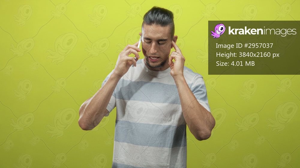 Man holding smartphone to ear and pressing opposite ear with hand in studio; concern focus communication.
