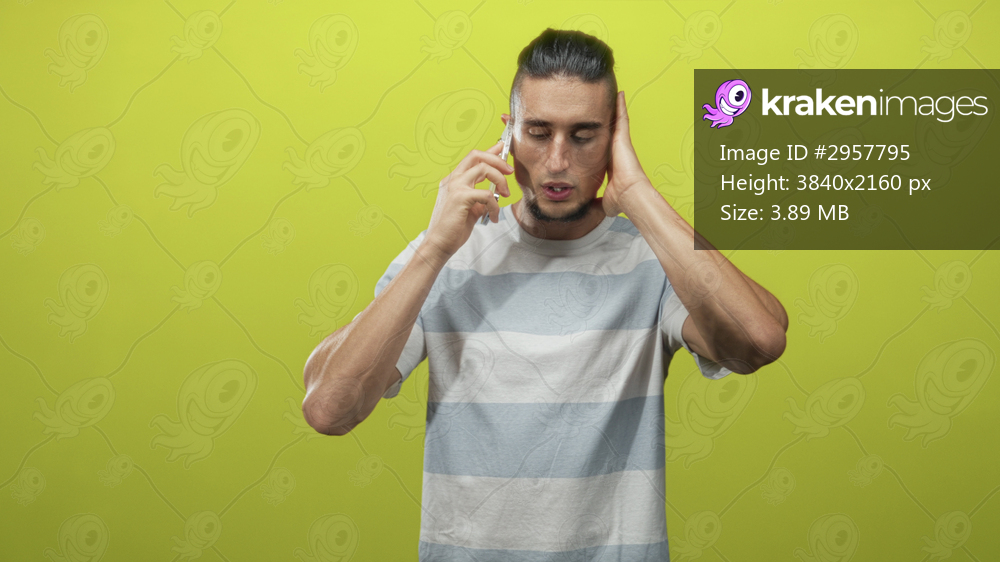 Man holding smartphone to ear and pressing opposite ear with hand in studio; concern focus communication.