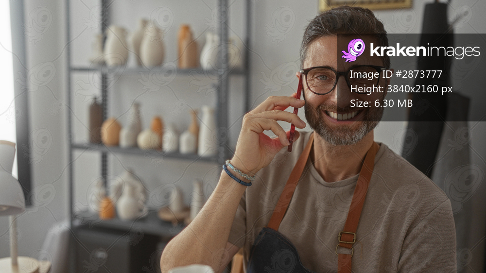 Man holding smartphone to ear, smiling in studio with pottery on shelves while wearing apron and glasses; creative connection joy.
