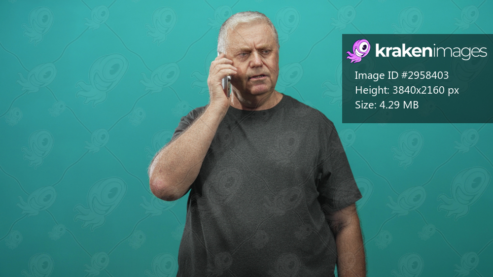 Man holding smartphone to ear, talking with furrowed brow and grey hair, wearing dark tshirt against teal studio backdrop, mid chest frontal pose; concern isolation. - Kraken Images
