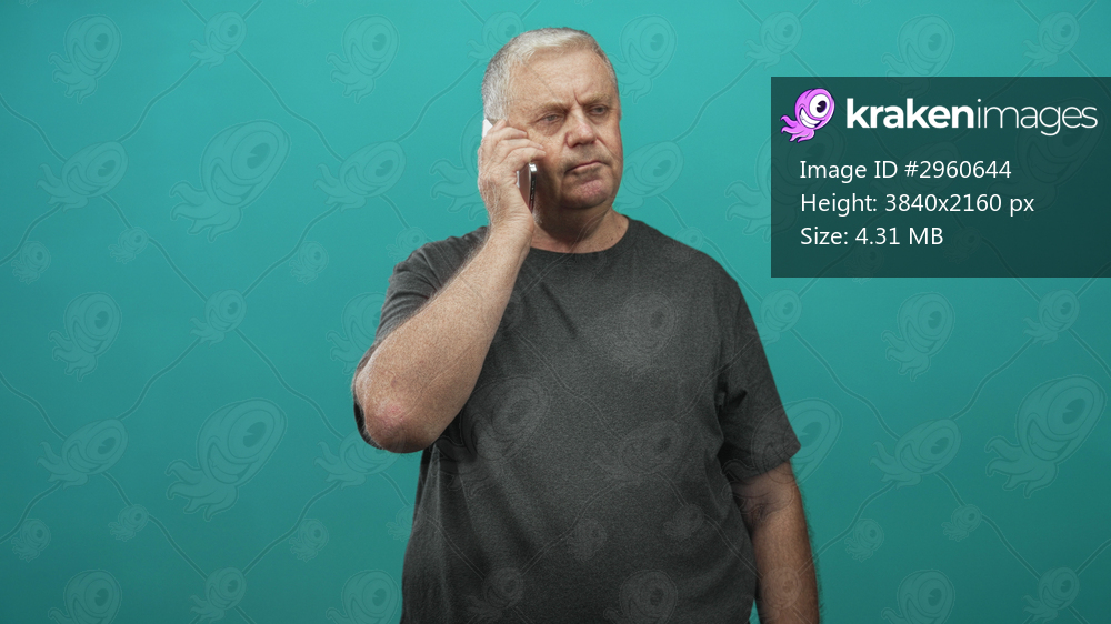 Man holding smartphone to ear, talking with furrowed brow and grey hair, wearing dark tshirt against teal studio backdrop, mid chest frontal pose; concern isolation. - Kraken Images