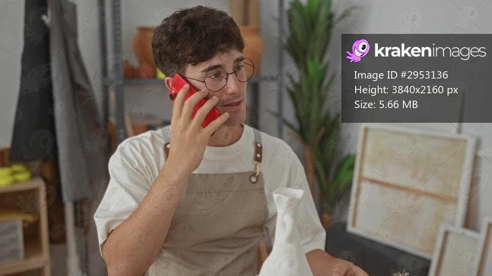 Man holding smartphone to ear talking while shaping pottery in studio with apron and canvas frames visible; calm concentration.