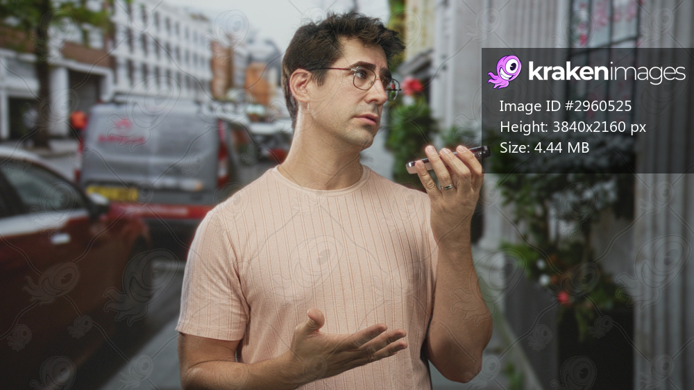 Man holding smartphone to mouth and speaking into speakerphone with hand raised, wearing glasses, standing on a crowded city street lined with parked cars; concern. - Kraken Images