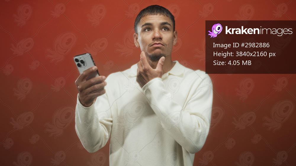 Man holding smartphone and touching chin in studio with red backdrop, checking screen and shifting hand to mouth across a brief sequence; thoughtful reflection. - Kraken Images