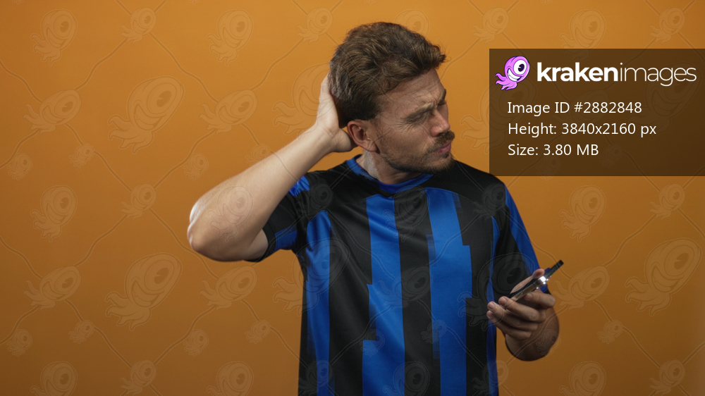 Man holding smartphone and touching his temple with his hand while looking down at the screen in an orange studio wearing a blue striped jersey; confusion. - Kraken Images