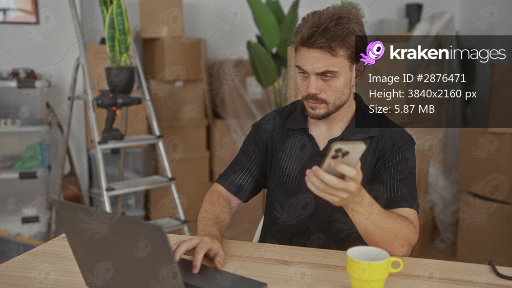 Man holding smartphone and typing on laptop with hands amid packed cardboard boxes and ladder in building; concentration moving home.