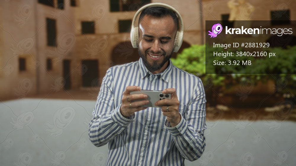 Man holding smartphone with visible hands and thumbs, wearing headphones and smiling while standing on a cobbled street by a historic building and fountain; joyful gaming. - Kraken Images