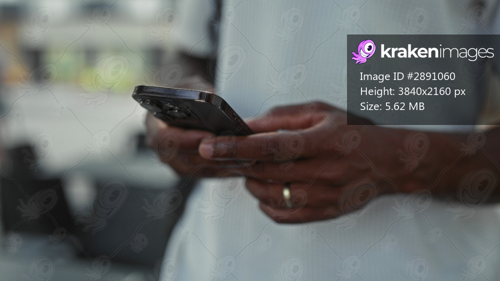 Man holding smartphone with visible hands and wedding ring, wearing white shirt on a city street near cafe tables; digital focus.