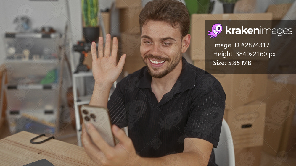 Man holding smartphone, waving and blowing a kiss with hand to mouth while sitting among moving boxes in building; happiness.