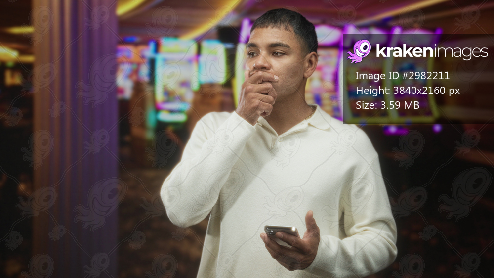 Man holding smartphone while touching chin in casino with neon slot machines, carpeted aisle and column visible; contemplation decision.