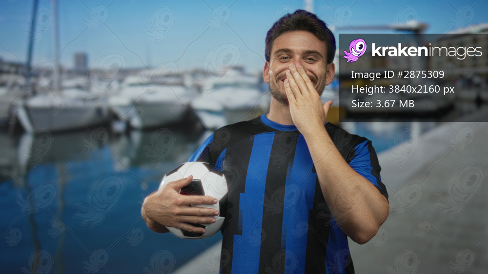 Man holding soccer ball at a marina street by boats, hand covering mouth smiling, wearing blue and black jersey; joy team spirit.