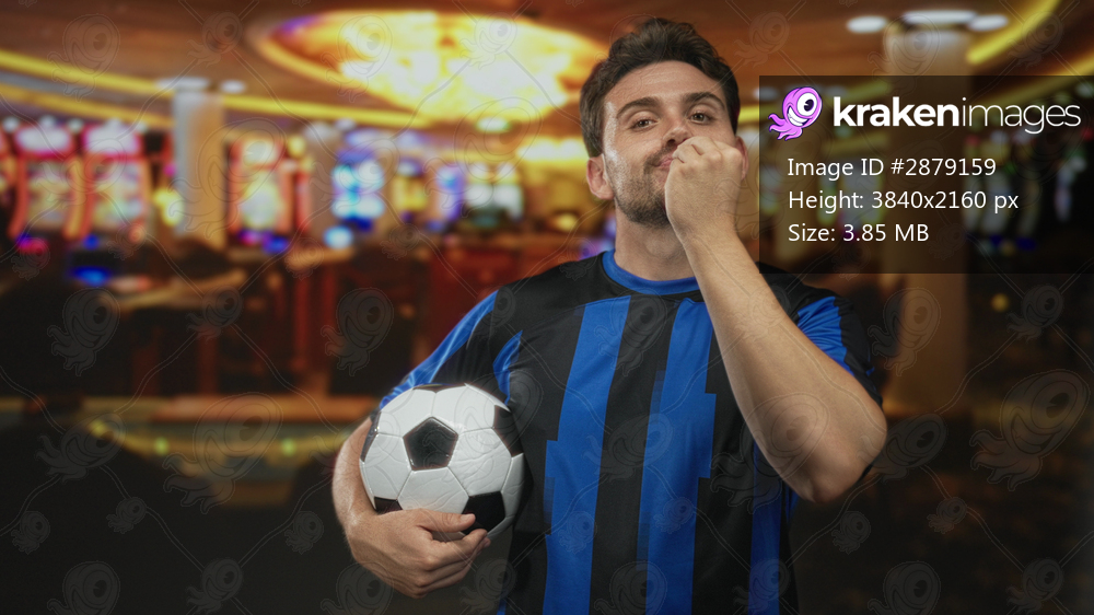 Man holding soccer ball and blowing kiss in casino building while wearing blue and black jersey; playful wager.