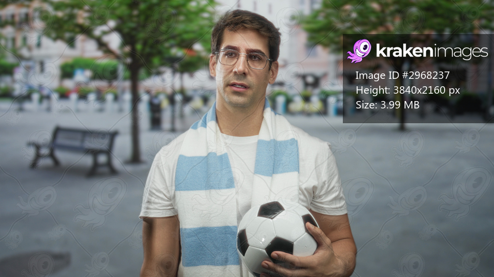 Man holding soccer ball with blue white fan scarf over shoulders on city street bench area, glasses visible; longing.