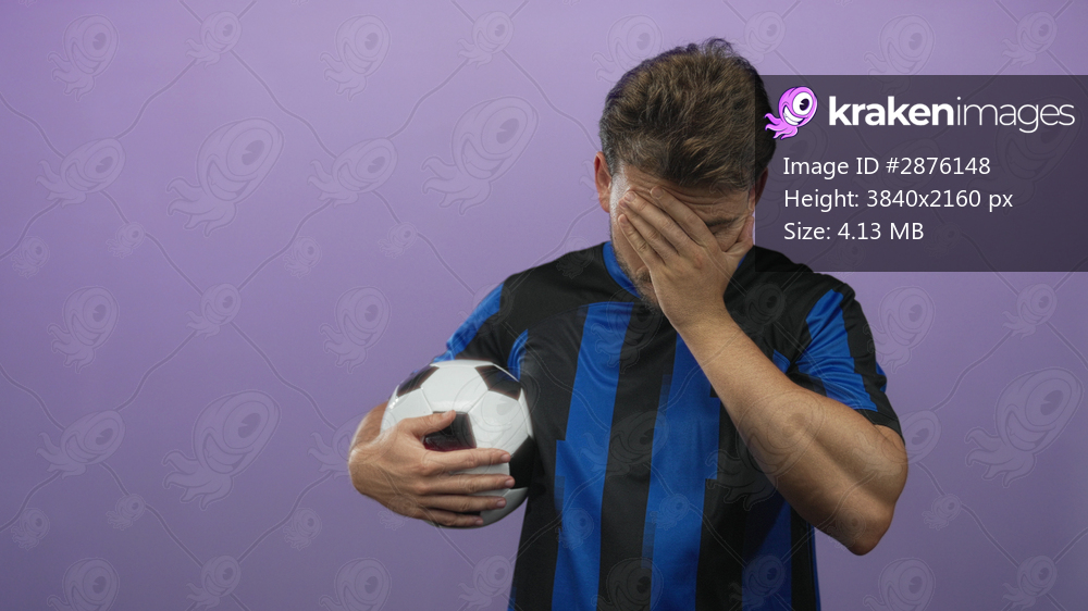 Man holding soccer ball and covering face with hand while wearing blue and black jersey in purple studio; sports frustration.