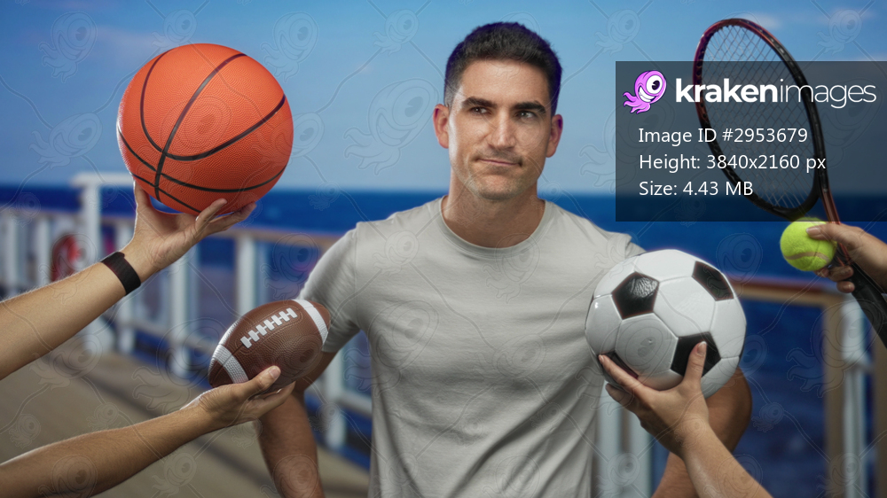 Man holding soccer ball and football on cruise deck with basketball and tennis racket nearby; indecision.