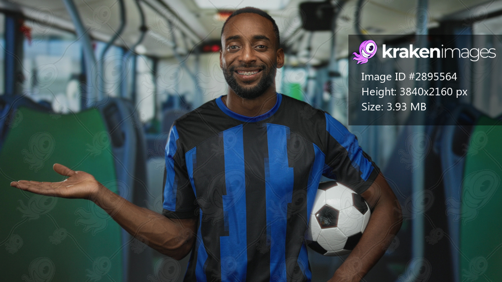 Man holding soccer ball giving thumbs up inside bus on street, wearing blue black striped jersey and smiling; team pride.