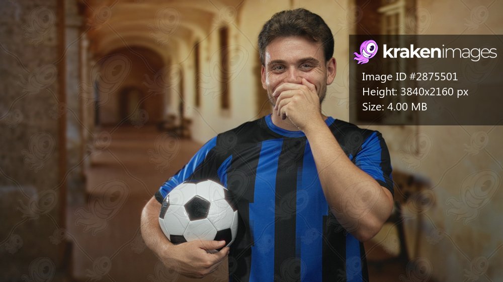 Man holding soccer ball with hand covering mouth laughing in old town building corridor wearing blue and black jersey and short sleeves; joy team spirit. - Kraken Images