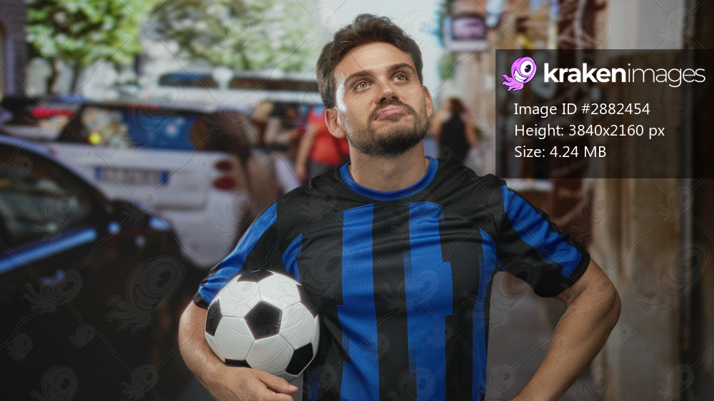 Man holding soccer ball with hand on hip on street in city wearing blue and black jersey while looking upward; confidence ambition.