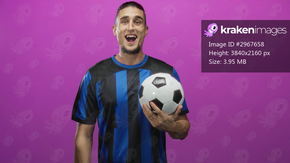 Man holding soccer ball with hand, smiling in studio wearing blue striped jersey; joyful celebration.