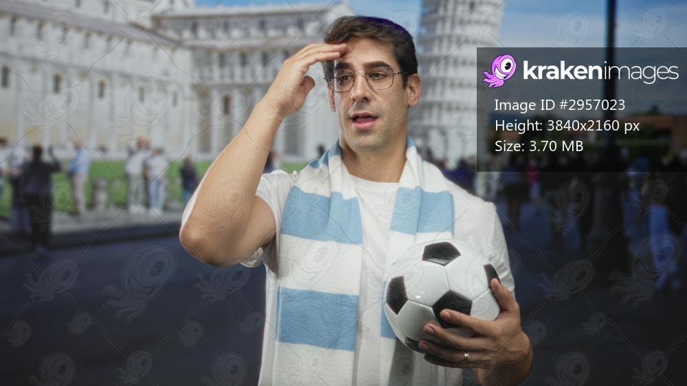 Man holding soccer ball, hand to forehead while adjusting glasses at building piazza near leaning tower; pride travel.