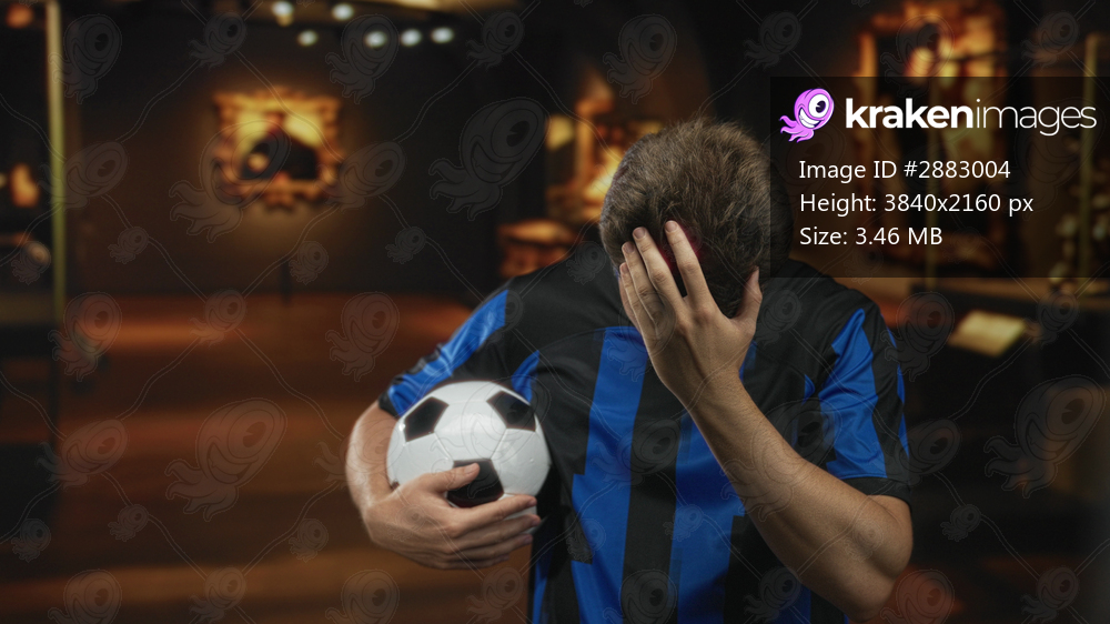 Man holding soccer ball with hand to head gesture in gallery building under warm lights; disappointment reflection regret.
