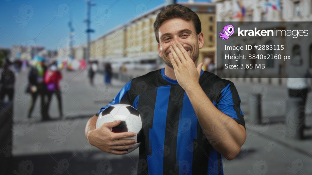 Man holding soccer ball, hand to mouth, smiling and wearing blue striped jersey in busy city street; amused casual.