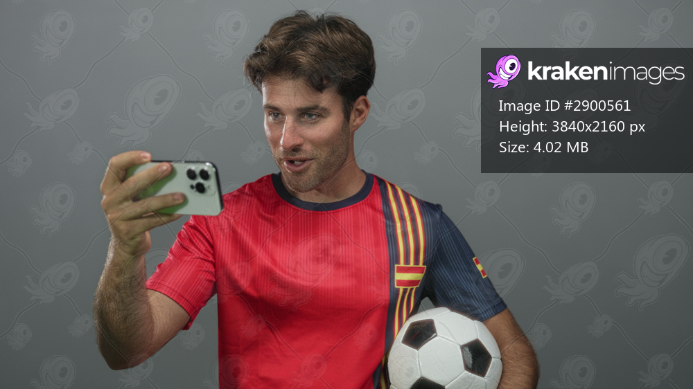 Man holding soccer ball with hand while taking a selfie with smartphone in gray studio; team spirit excitement.