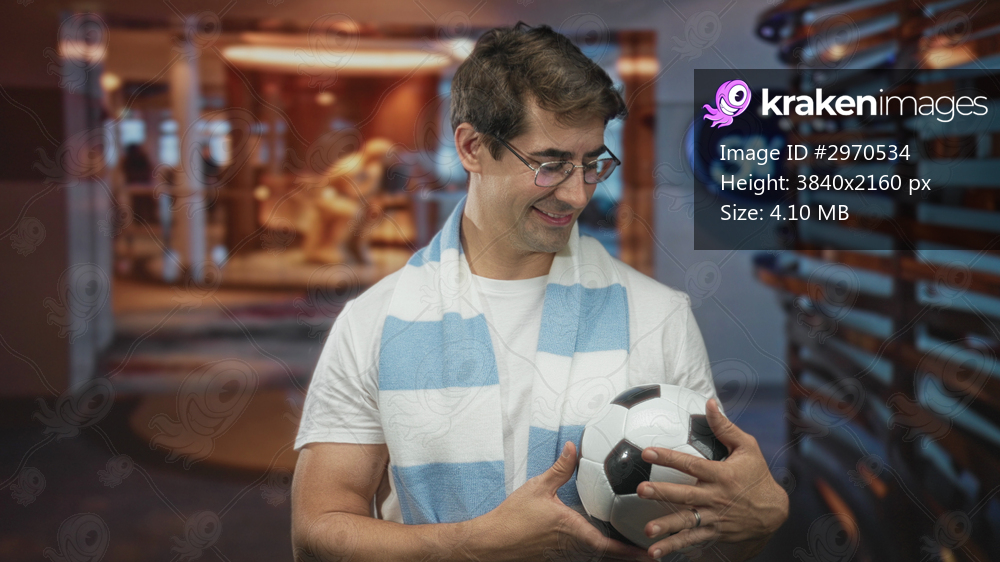 Man holding soccer ball with hands, smiling and looking down, wearing blue striped scarf and glasses in studio; pride team spirit.