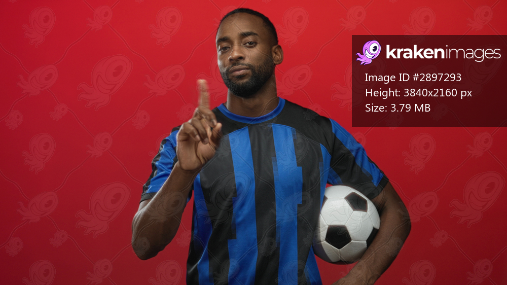 Man holding soccer ball and pointing finger in studio against red backdrop, wearing blue striped jersey; confidence focus.