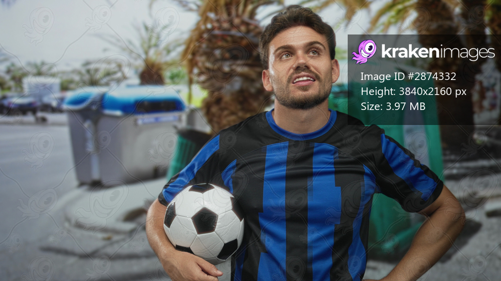 Man holding soccer ball under arm by recycling containers on street, hand on hip and smirking; urban grit determination.
