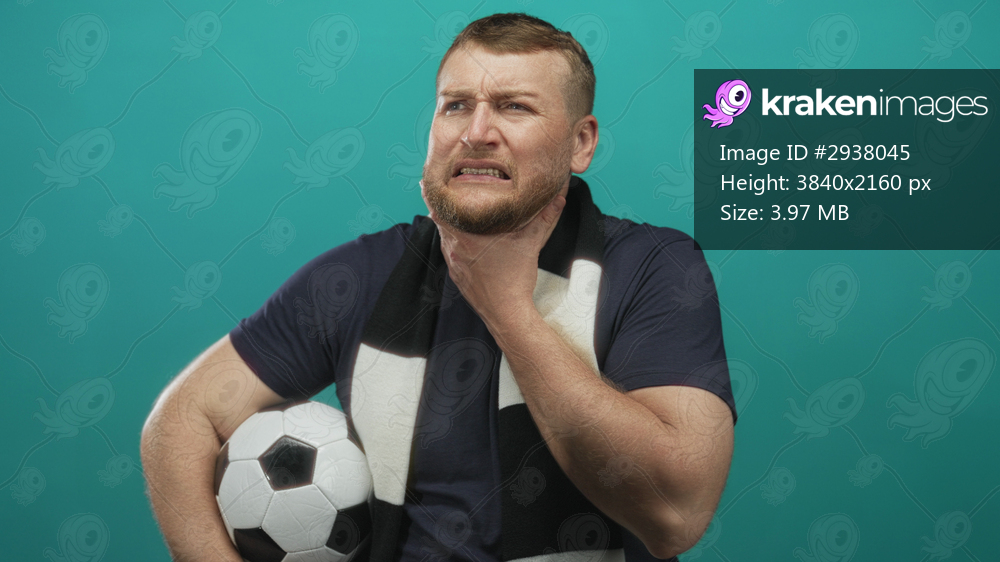 Man holding soccer ball while wearing black and white fan scarf, clutching throat with pained expression in teal studio backdrop; pain.