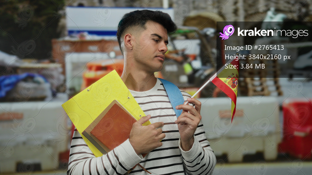 Man holding spanish flag and folders stands pensively at a construction site on a city street.