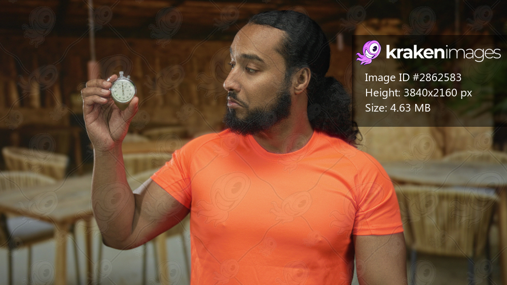 Man holding stopwatch, hand to chin while checking time on a restaurant terrace outdoors, wearing orange shirt; time pressure impatience.