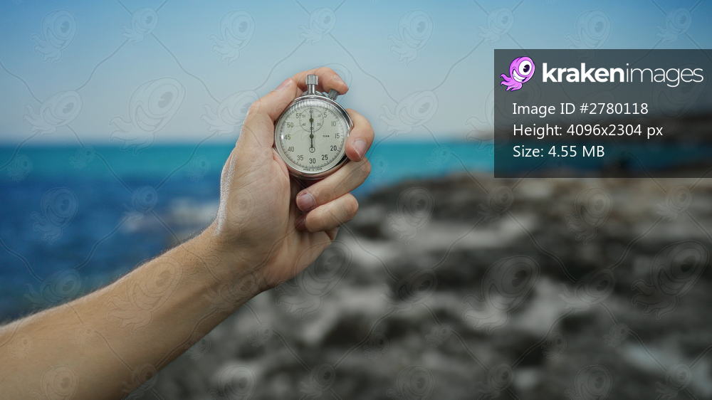 Man holding stopwatch on a scenic seaside beach with a clear blue sky, illustrating precision and timing in an outdoor setting.