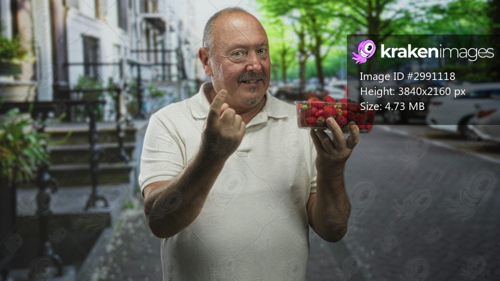 Man holding strawberry and pointing finger with bare hand on city street, smiling at camera; playful appetite friendly.