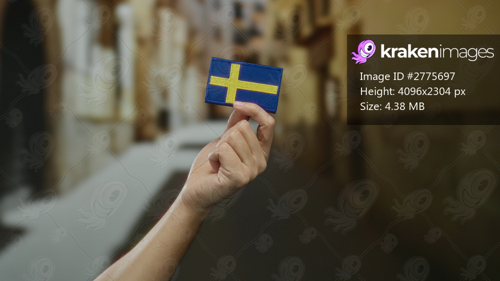 Man holding swedish flag in a city street, showcasing national pride with scandinavian emblem outdoors during daytime.