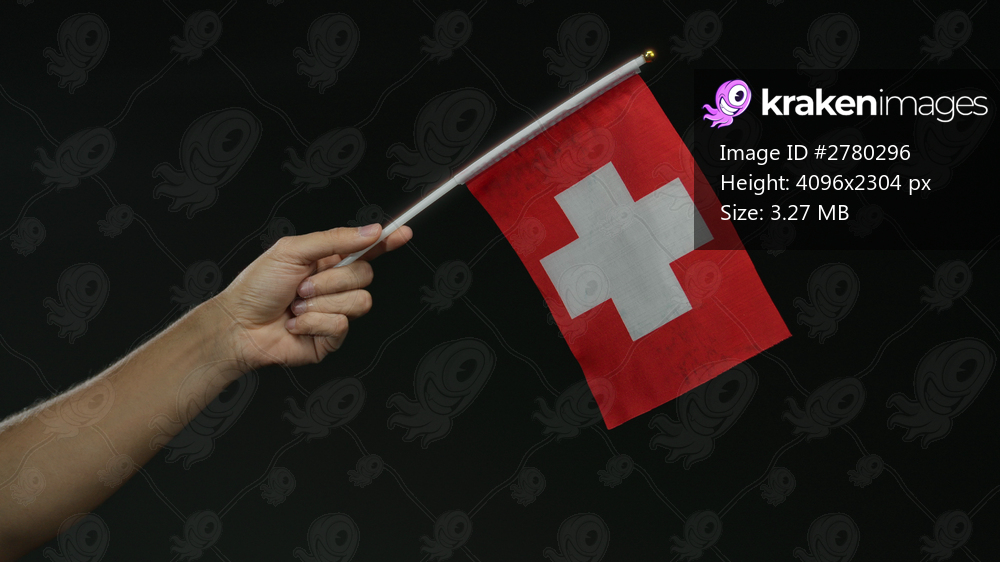 Man holding swiss flag against black background with focus on hand and isolated environment, highlighting swiss culture and national identity