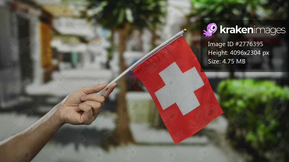 Man holding swiss flag in outdoor city setting, showing national pride with clear focus on the flag and background blur.