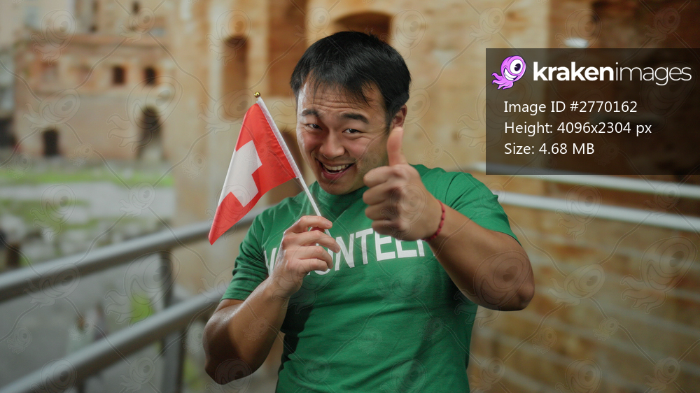 Man holding swiss flag in urban area, wearing green shirt with volunteer text, smiling and showing thumb up gesture, standing on street in daytime.