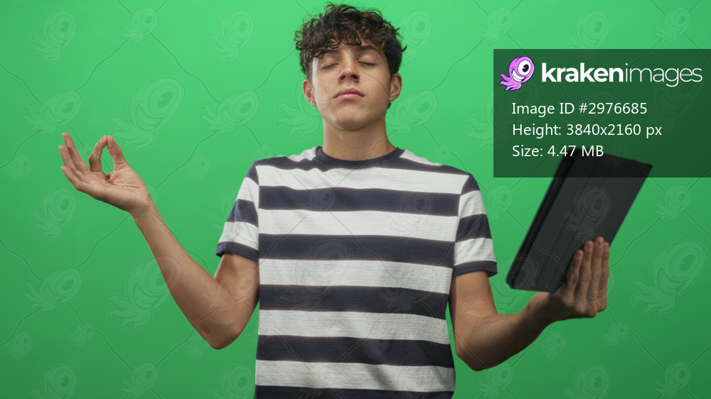 Man holding tablet with black cover, eyes closed making ok hand sign while wearing striped shirt in studio with green screen backdrop; mindfulness calm. - Kraken Images