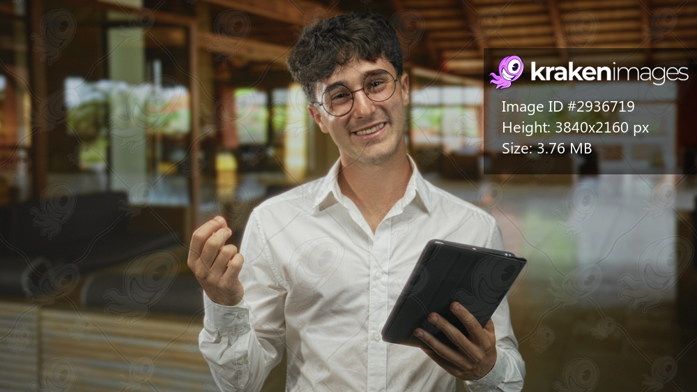 Man holding tablet and gesturing with hand in hotel building; friendly confident presentation and focus.