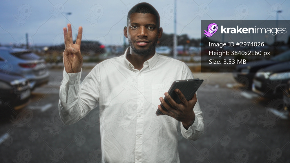 Man holding tablet holds up five fingers in a street parking lot while smiling and counting; confidence greeting.