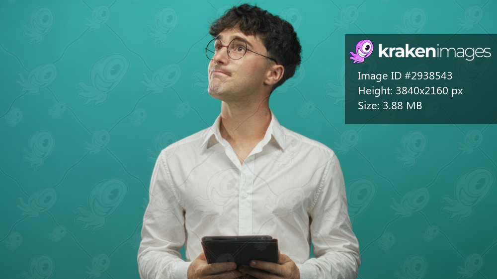 Man holding tablet and looking up with a slight smile in a teal studio wearing a white shirt and round glasses; thoughtful curiosity ambition.