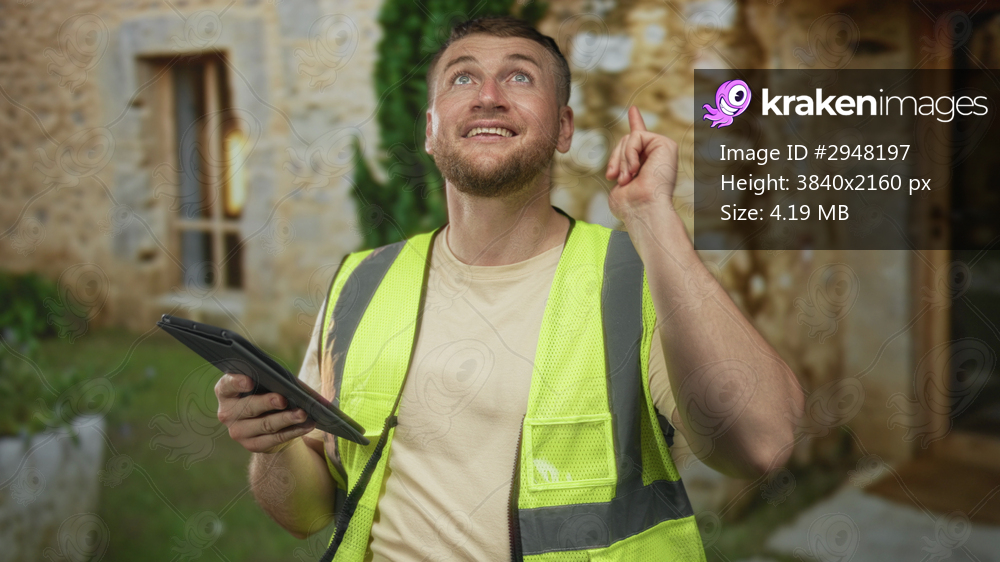 Man holding tablet points finger upward at building entrance in hi vis vest smiling and looking up; confidence readiness.