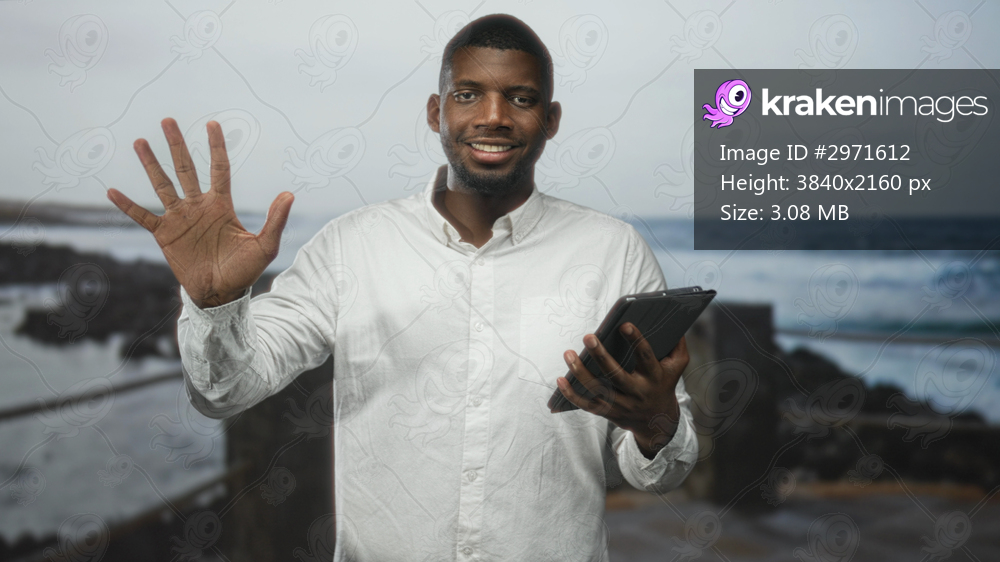 Man holding tablet with right hand raised in wave on a street by the sea; warmth welcome connection.