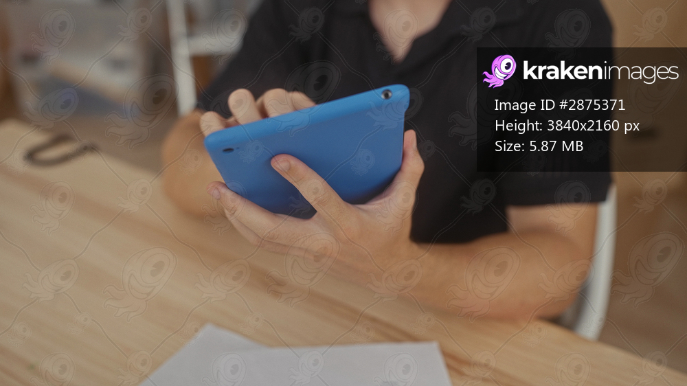 Man holding and tapping a blue tablet with fingertips at a wooden table in building, hands visible; focus productivity.